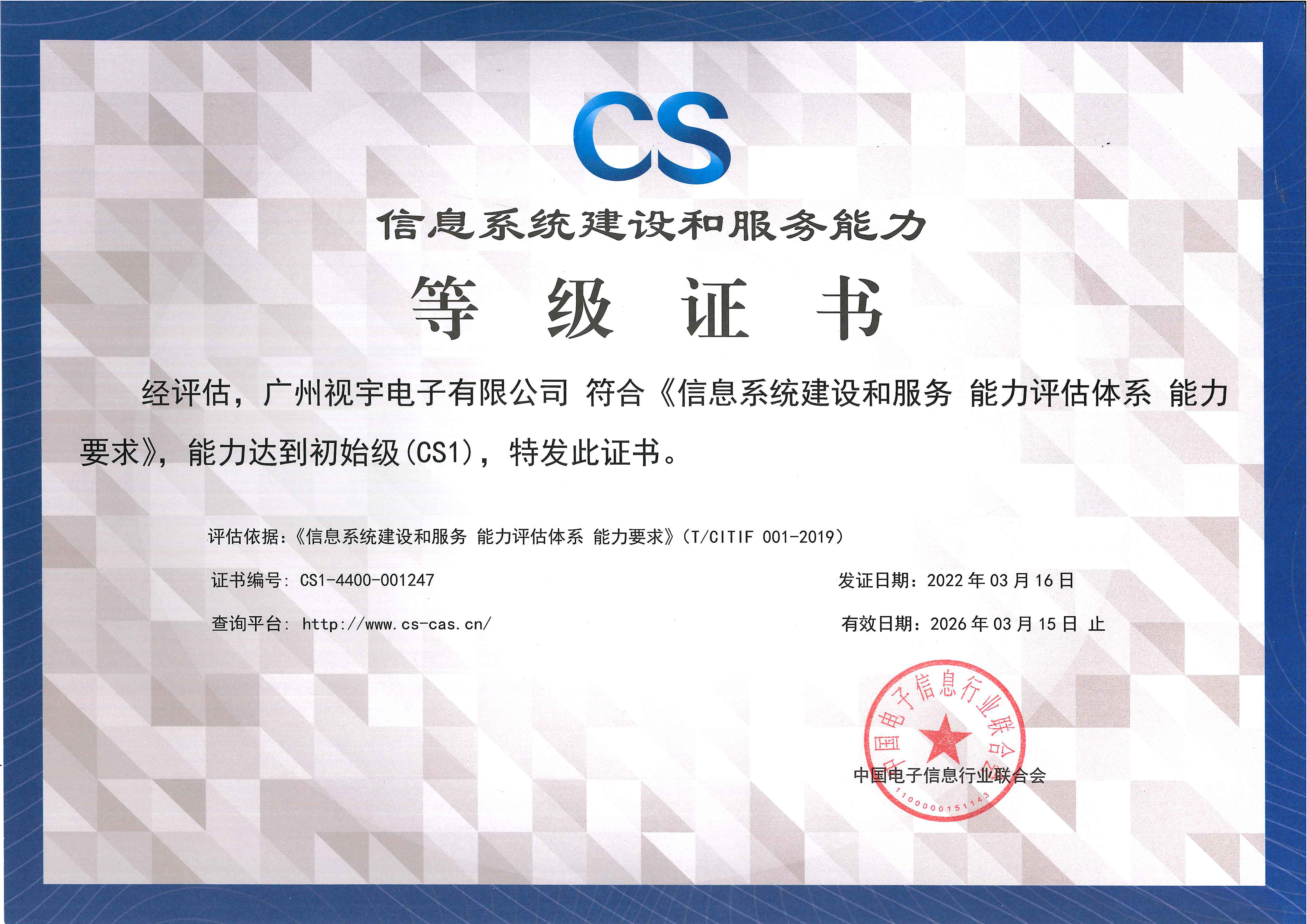 公司是广州市高新技术企业,持有多项软件著作权与专利发明,持有《广东省安全技术防范系统设计、施工、维修》资质,是广东省安全技术防范系统协会理事单位;具备信息系统建设和服务能力等级证书等。通过了ISO9000质量体系认证,ISO14001环境管理体系认证,ISO45001职业健康安全管理体系认证,ISO/IEC 27001 信息安全管理体系认证,ISO/IEC 20000信息技术服务管理体系认证;连续多年为广东省守合同重信用企业;多年广州市A级纳税企业,中国招标投标网认定3A信用等级等。